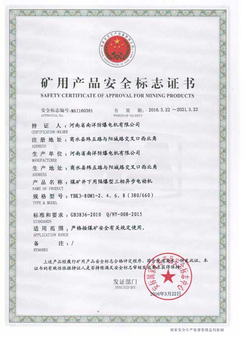 本系列電動機符合 GB755-2008《旋轉(zhuǎn)電機定額和性能》、企業(yè)標(biāo)準(zhǔn)Q/320206JLAB88-2010《YBK3系列煤礦并下用隔爆硯三相異步電動機技術(shù)條件(機座號H100-355)》。其防爆性能符合BG3836.1-2010《爆炸性環(huán)境第1部分:設(shè)備通用要求》和GB3826.2-2010《爆炸性環(huán)境第2部分:由隔爆外殼"d"保護(hù)的設(shè)備》、也符合MT451一l995《煤礦用隔爆型低壓三相異步電動機安全性 能通用技術(shù)規(guī)范》的規(guī)定,制成隔爆科ExdI適用于煤礦井下爆炸性氣體環(huán)境的危險場所。也符合IEC79-1,BS4683和EN50018的規(guī)定,制成隔爆型。防爆標(biāo)識為ExdI Mb,使用有爆炸性氣體混合物存在的場所。ExdI Mb適用于煤礦采掘工作面具有甲烷或煤塵的爆炸性混合物存在的工作環(huán)境。