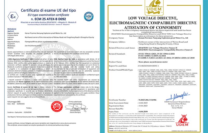 近日,河南省南洋防爆電機有限公司傳來喜訊:公司自主研發(fā)生產(chǎn)的防爆電機產(chǎn)品,順利通過權(quán)威機構(gòu)的嚴(yán)格檢測與審核,正式獲得CE認(rèn)證證書與ECM 25 ATEX-B D092證書。這兩項國際權(quán)威認(rèn)證的取得,不僅標(biāo)志著南洋防爆電機的產(chǎn)品質(zhì)量、安全性能達(dá)到了國際標(biāo)準(zhǔn),也為企業(yè)進(jìn)一步拓展海外市場奠定了堅實基礎(chǔ)。